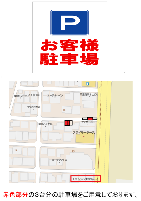 駐車場も完備しておりますので、お車でもお気軽にご来店下さい。